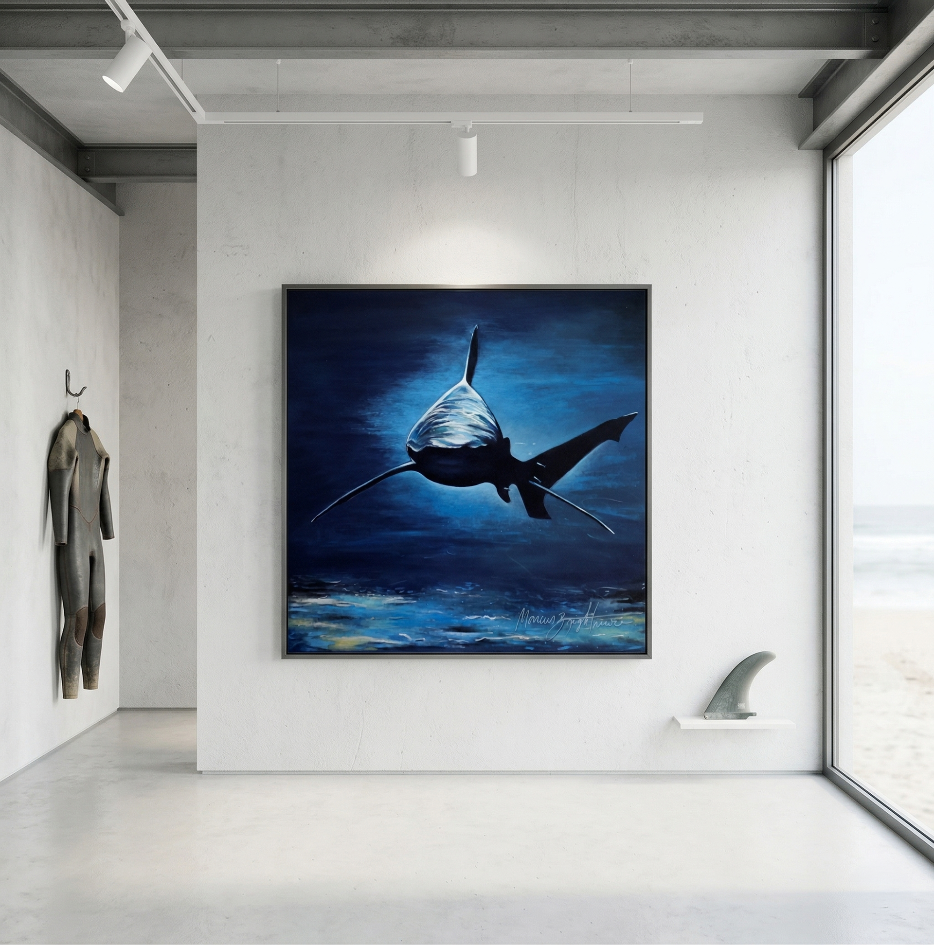 "This painting was born from a vivid dream, a bull shark circling around me in calm, powerful silence. It wasn't an attack. It was an encounter. The deep blue is the unconscious, and the shark is everything that frightens us from a distance but teaches us something about ourselves when faced up close. True strength doesn't need noise; it moves quietly beneath the surface, steady and alive."