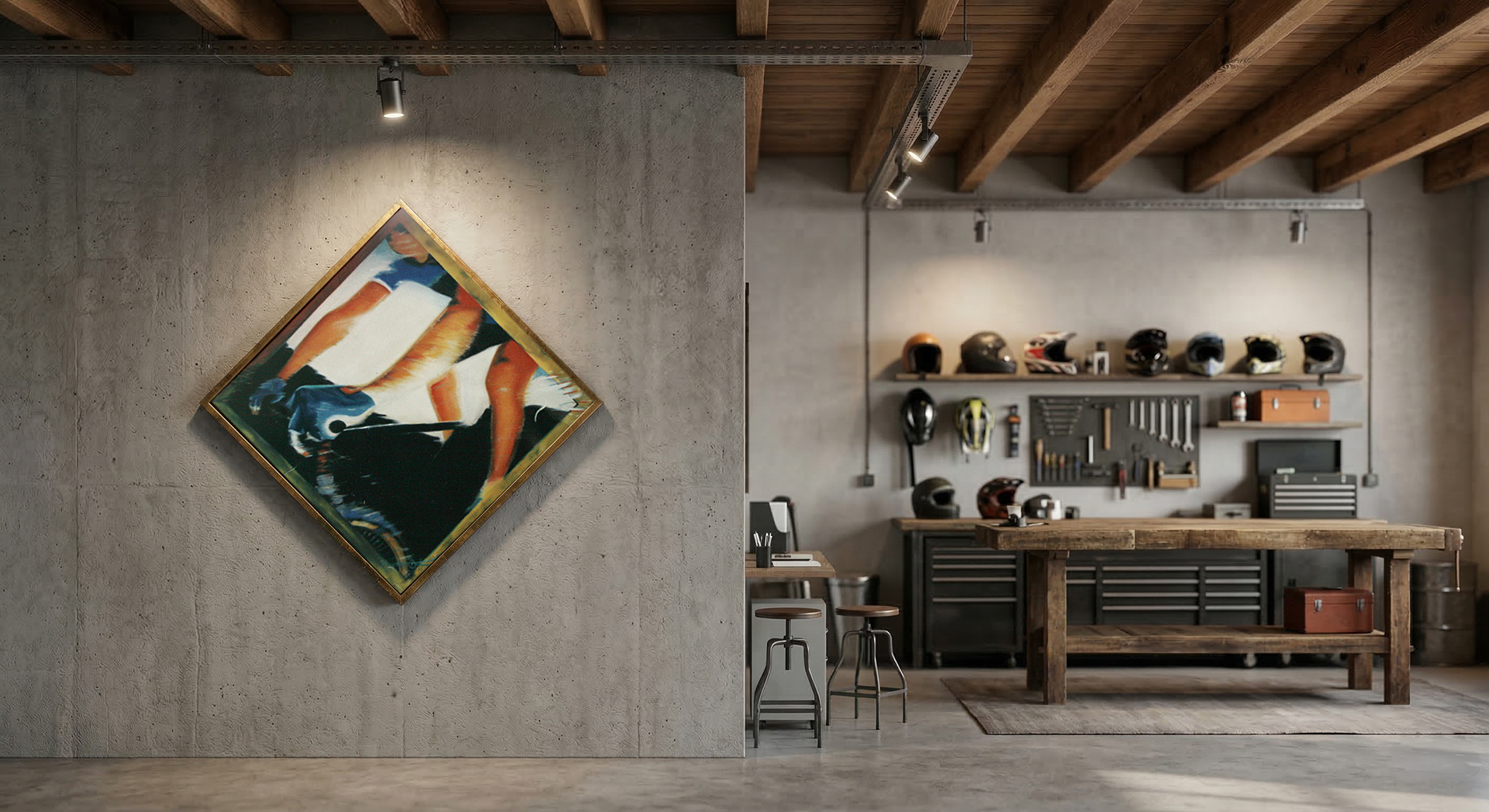 The artwork captures movement and the tension between body, speed, and balance. The fragmented human figure, combined with the presence of a mountain bike, suggests freedom, risk, and continuous flow. The diagonal composition reinforces a sense of motion, while the intense colours and blurred forms create the feeling of action and instinct, where body and bike merge into a single gesture.