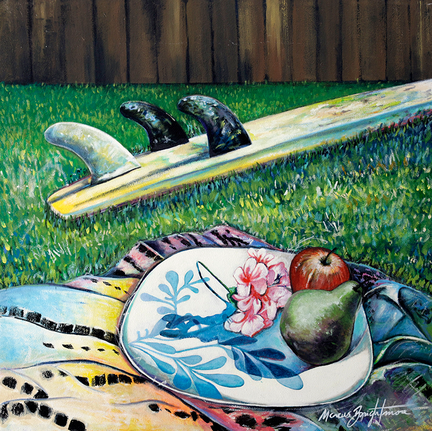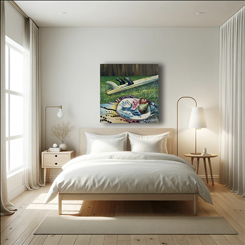 This painting is a symphony of summer's delights, capturing a leisurely moment steeped in the tranquillity of a picnic. Beside a surfboard, a ripe apple and a succulent pear compose this serene tableau. It's a celebration of the surfer's interlude, the sweetness of summer fruits, and the simple pleasures of life.