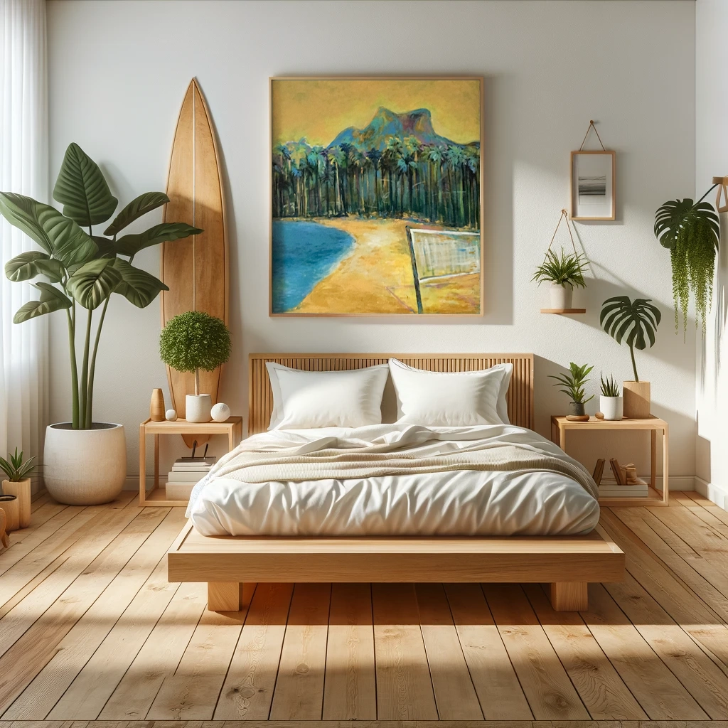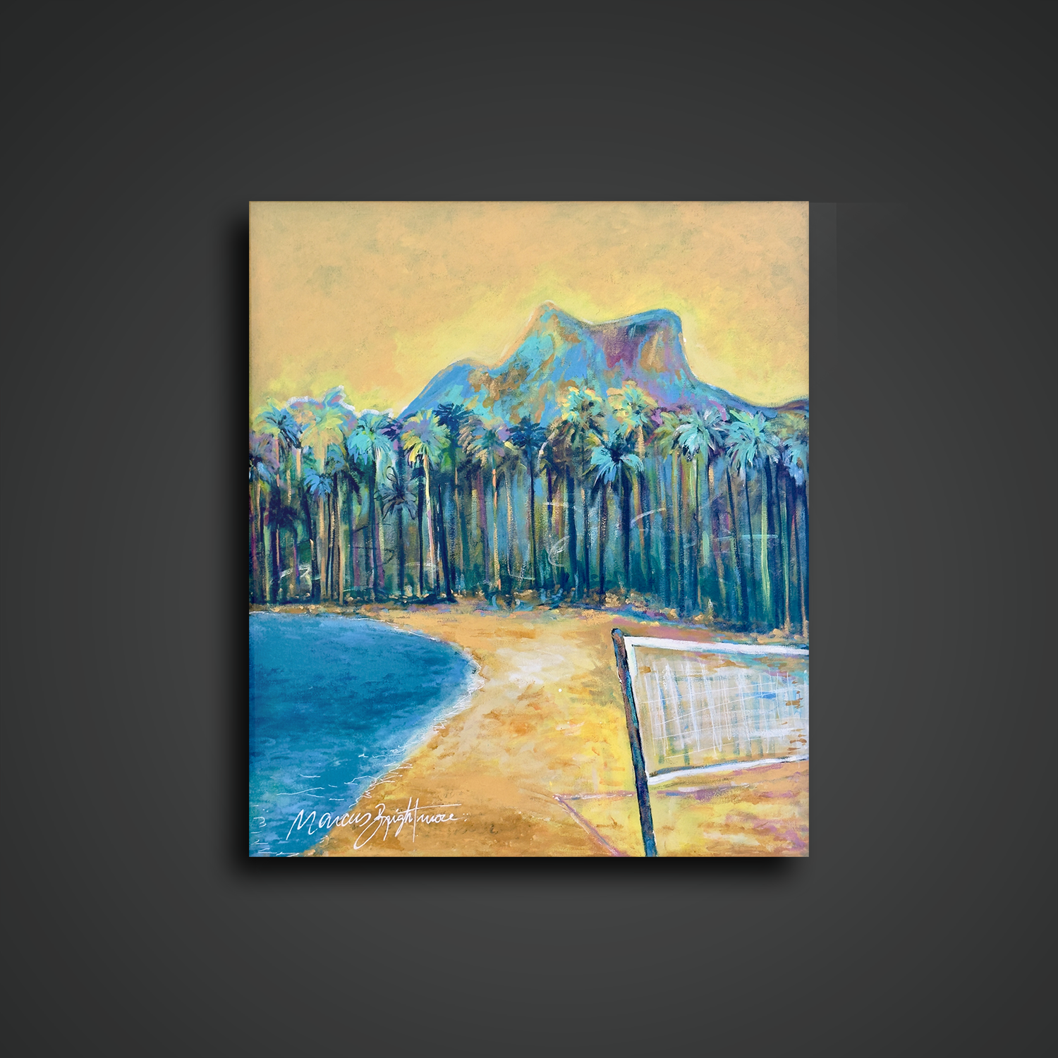The imposing Pedra da Gávea rises in this painting, dominating the landscape with its majestic presence. The golden sky enveloping the peak suggests the end of a warm day in Rio de Janeiro, while the silhouette of palm trees and the gentle curve of the beach invite a moment of relaxation and appreciation of nature. This canvas is a tribute to Rio's natural grandeur, capturing the tranquillity and beauty the city offers.