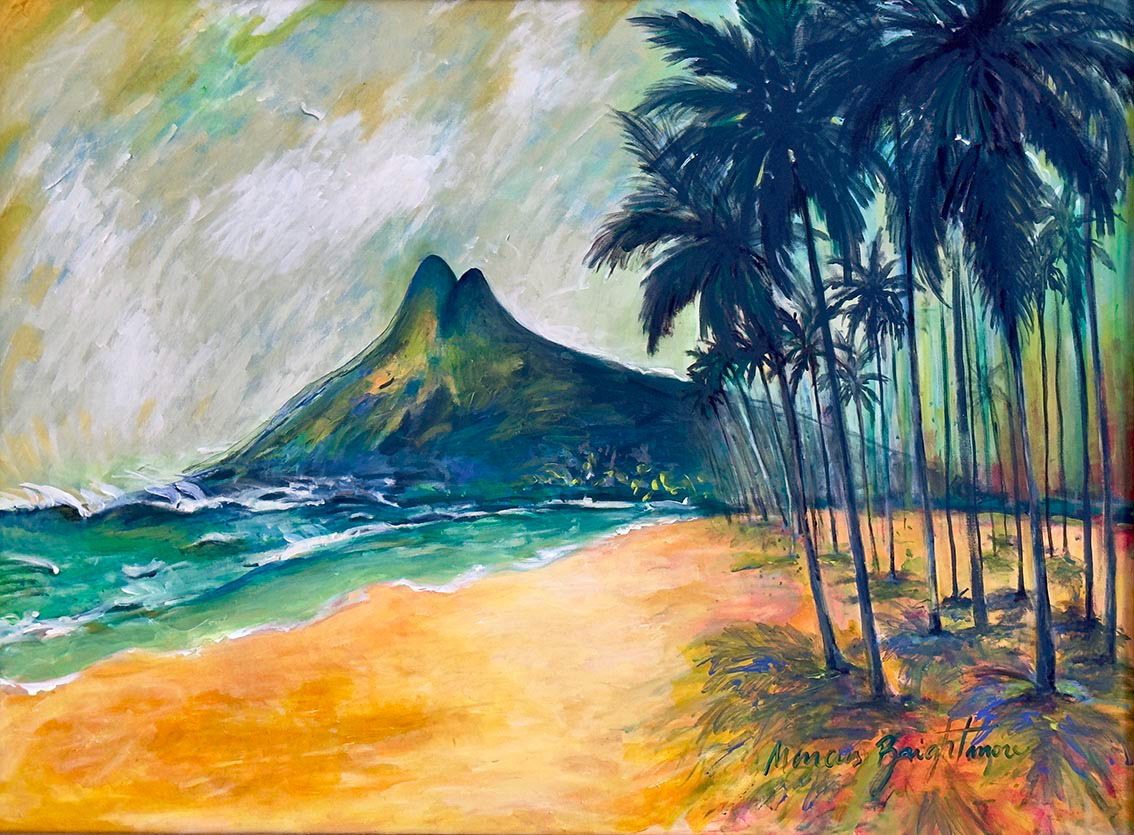 This painting captures the vibrant energy of Ipanema Beach with the iconic Two Brothers mountain in the background. The warm colour palette blends with the coolness of the waves, reflecting the pulsating soul of Rio de Janeiro. Gently swaying palm trees and golden sand complete the scene, inviting contemplation and the taste of the eternal Carioca summer.