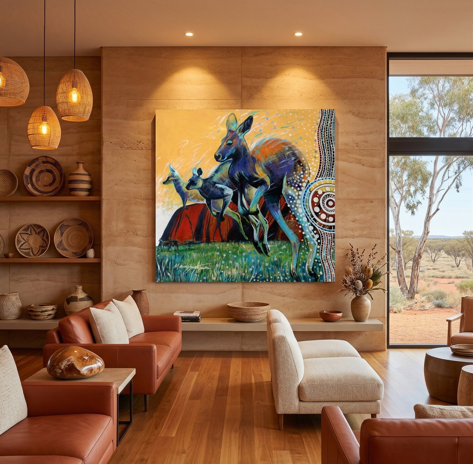 I had the privilege of meeting Aboriginal artists from a local tribe, a brief encounter, but one that left a permanent mark. There is a generosity in the way they share their visual language, and a responsibility in how you carry it forward. This painting is my response to that moment: kangaroos in motion, ochre earth, ceremonial patterns radiating outward, painted with deep respect for what I was shown.