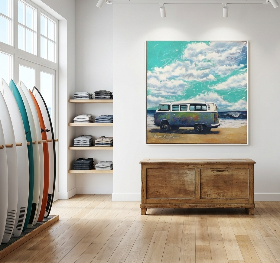 The artwork represents the idea of freedom, pause, and movement as a state of mind. The van parked by the ocean symbolises the meeting of road and sea, travel and contemplation. The open sky and moving clouds suggest a sense of spaciousness and slow time, while the vehicle becomes a metaphor for a life guided by the rhythm of nature, where the journey matters more than the destination.