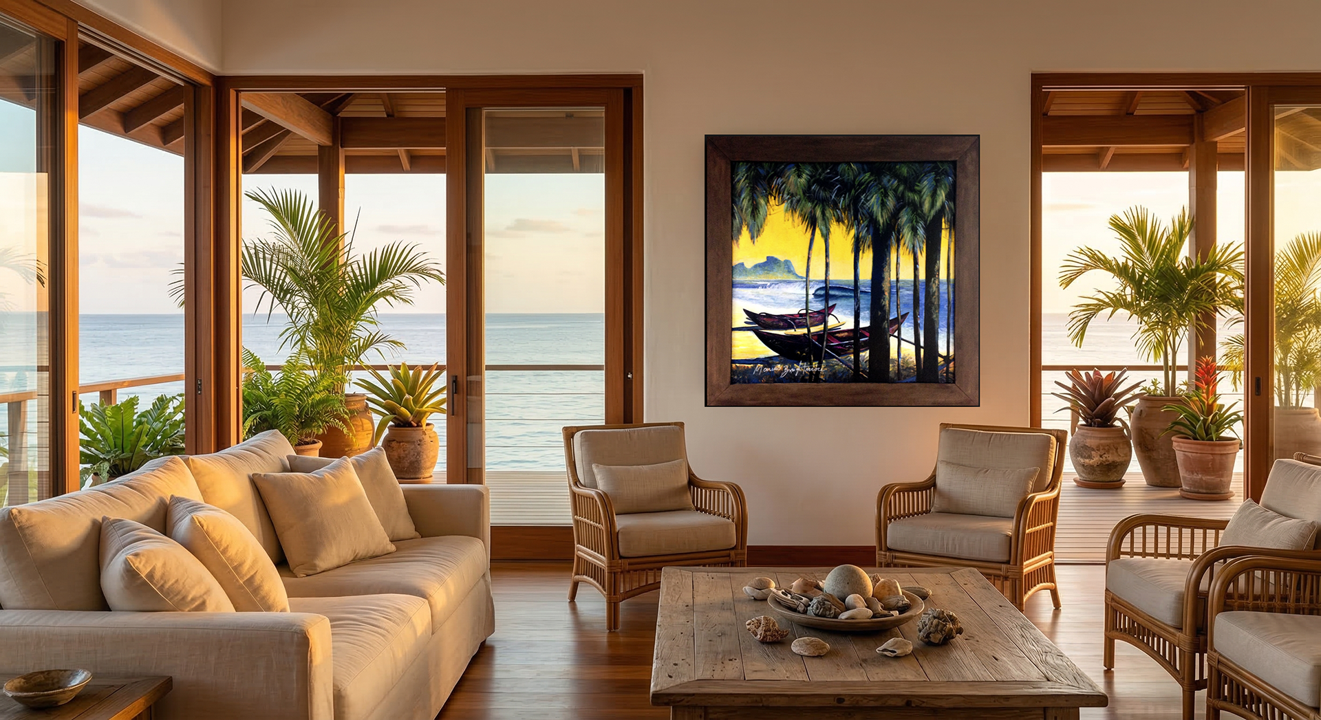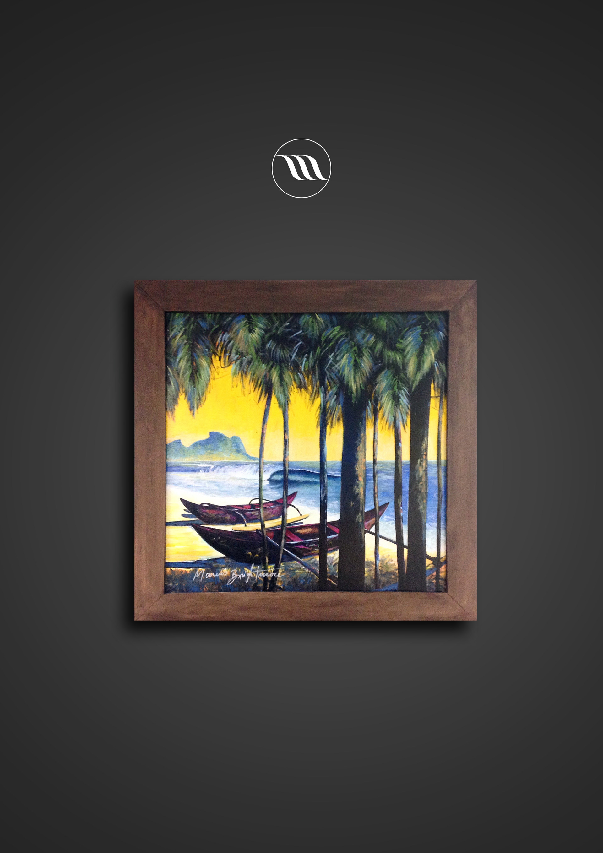 This painting depicts the majestic Pedra do Gigante, an iconic sentinel of Rio de Janeiro, viewed through a veil of palm trees at dusk. Canoes rest on the shore, evoking the rich maritime history and culture of the city. The warm hues of the sunset reflect the vibrant soul of Rio, while the tranquillity of the scene suggests a moment of peace and contemplation in the face of natural grandeur.
