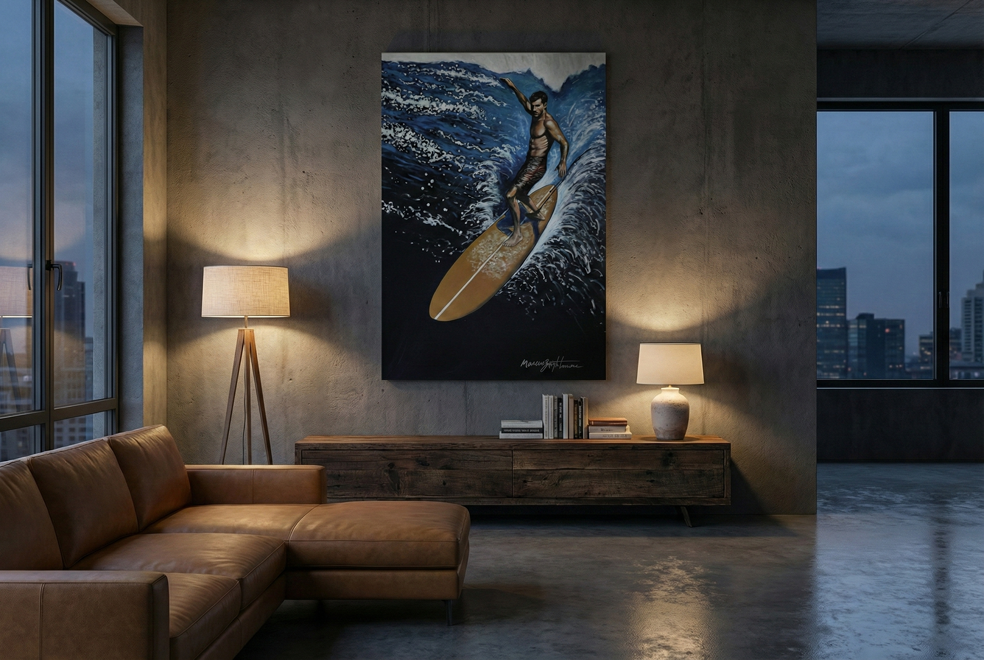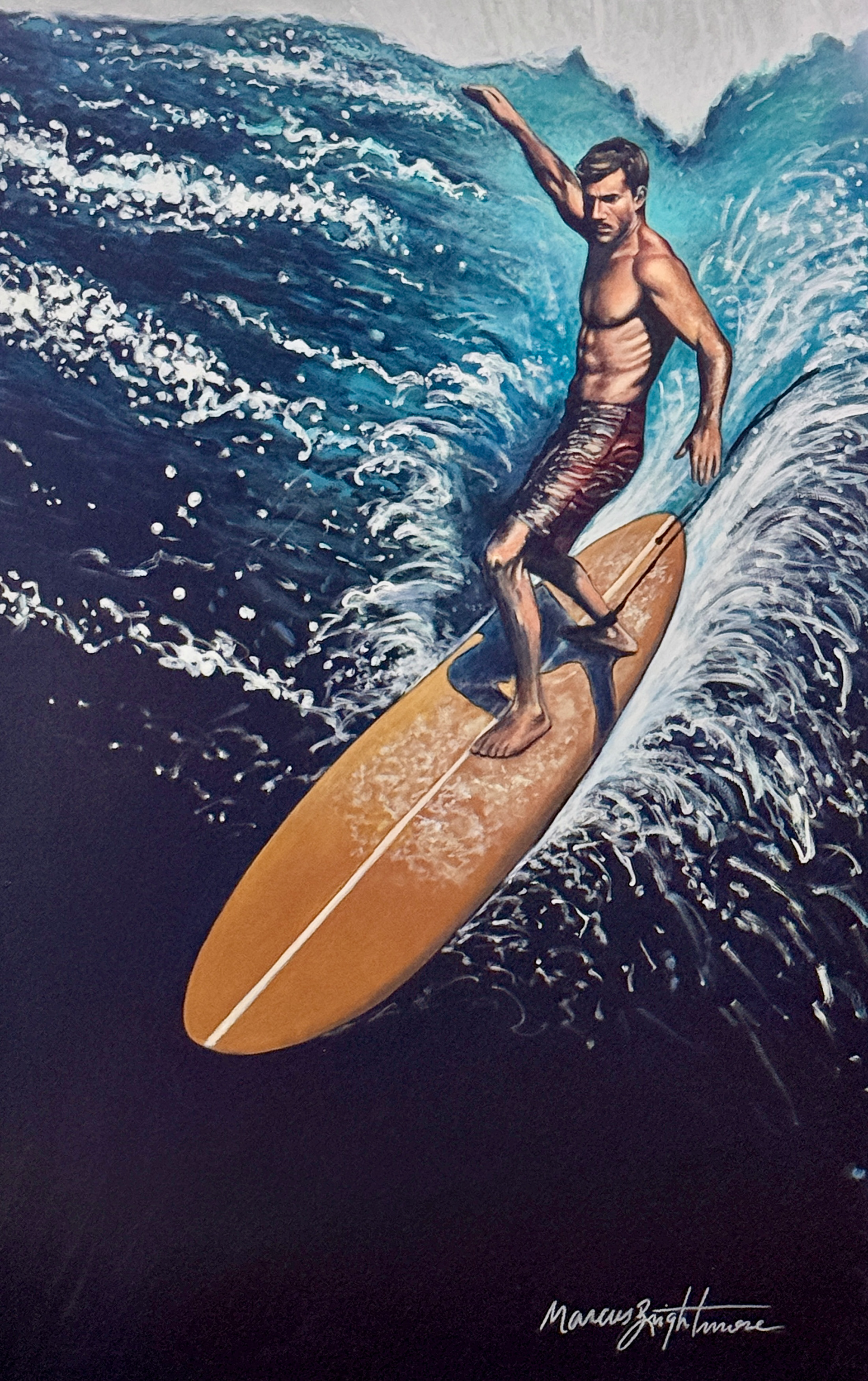 "Saltline captures the moment of the drop, that suspended instant between decision and fall. The deep black is not just water; it is the unknown that every surfer faces before every wave. The golden board and the body in balance above the abyss speak of something universal: the courage to commit, even without knowing what comes next."