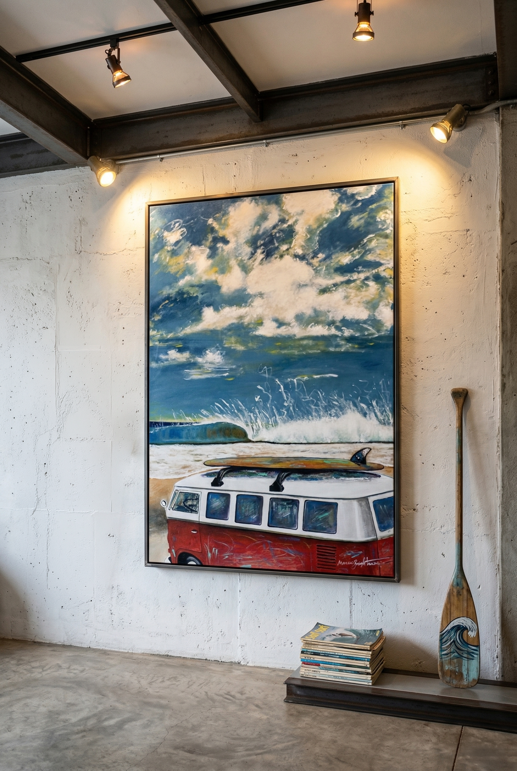 A red Kombi, a golden board on the roof, and a wave already breaking on the shore. Nobody in the frame, because anyone who has lived this moment knows exactly where they are standing.