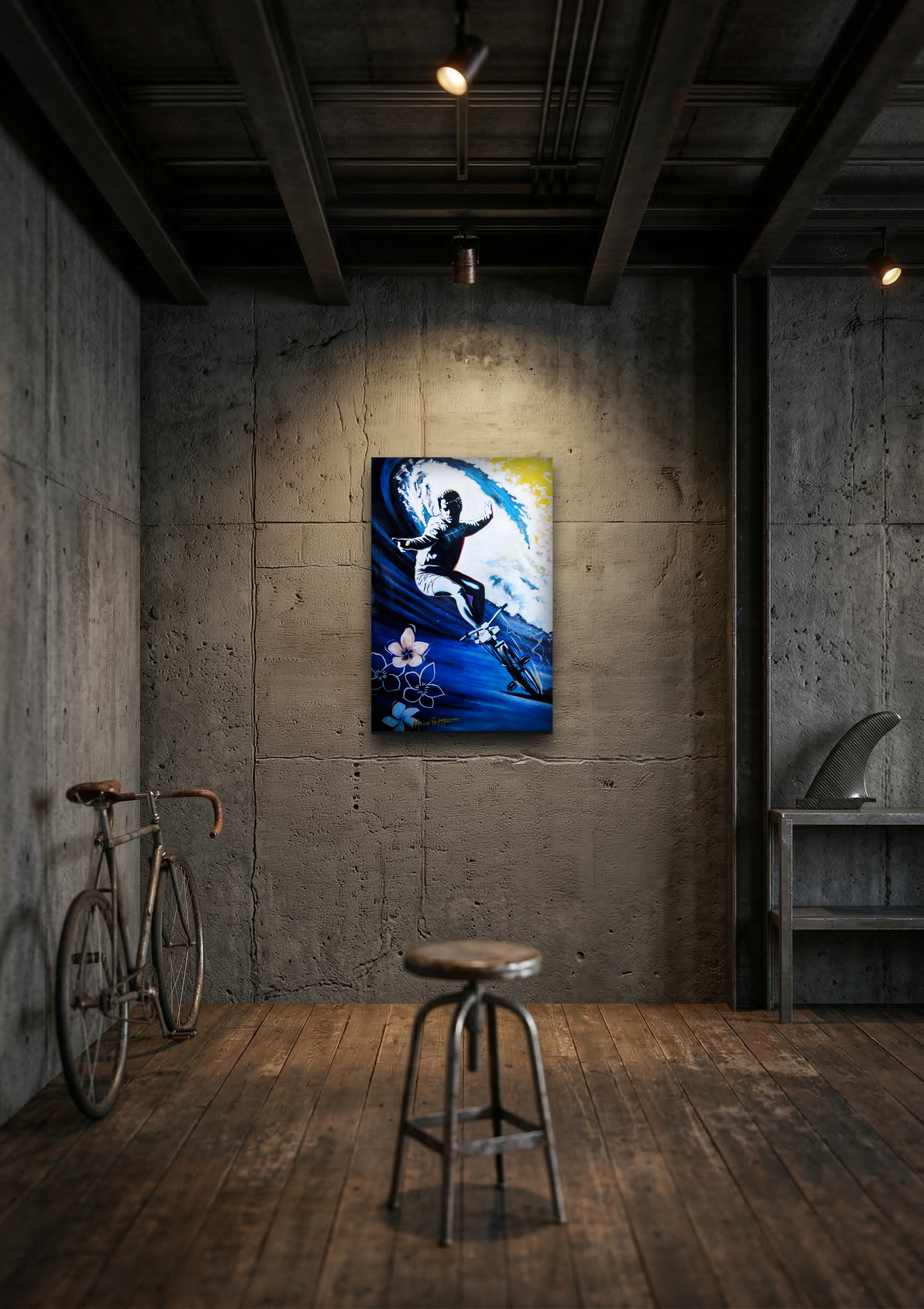 The artwork represents the translation of surfing movement into another medium. The black-and-white figure embodies balance and gesture, while the colourful waves symbolise the memory and essence of the ocean. The wave exists as an internal reference, not a literal setting, turning the scene into a poetic connection between body, movement, and imagination.