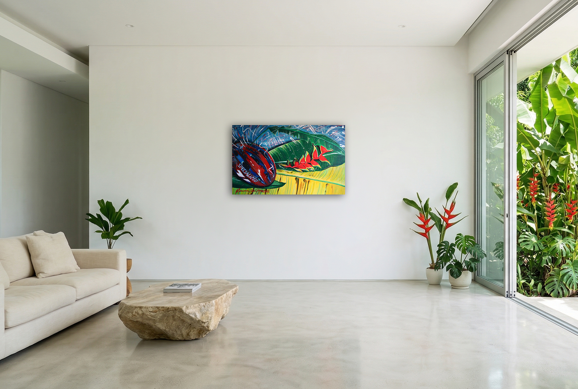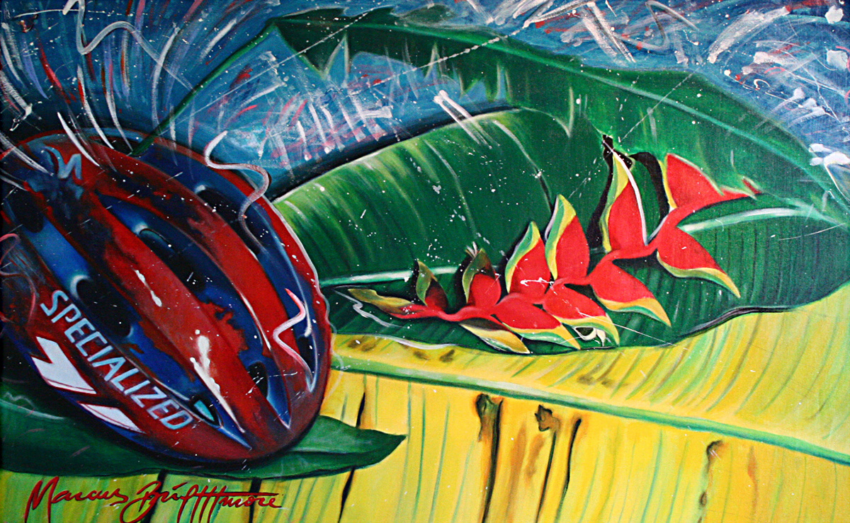 A Specialized helmet resting against a banana leaf, helicônias burning red beside it. Two worlds that don't usually share the same frame, the precision of the athlete and the extravagance of the tropics, finding that they have more in common than expected.